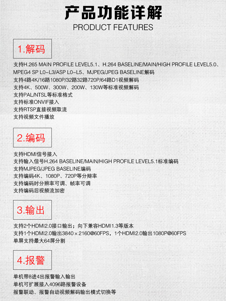 解碼能力 | 4/8/16/32路4K/1080P/720P/D1 |
