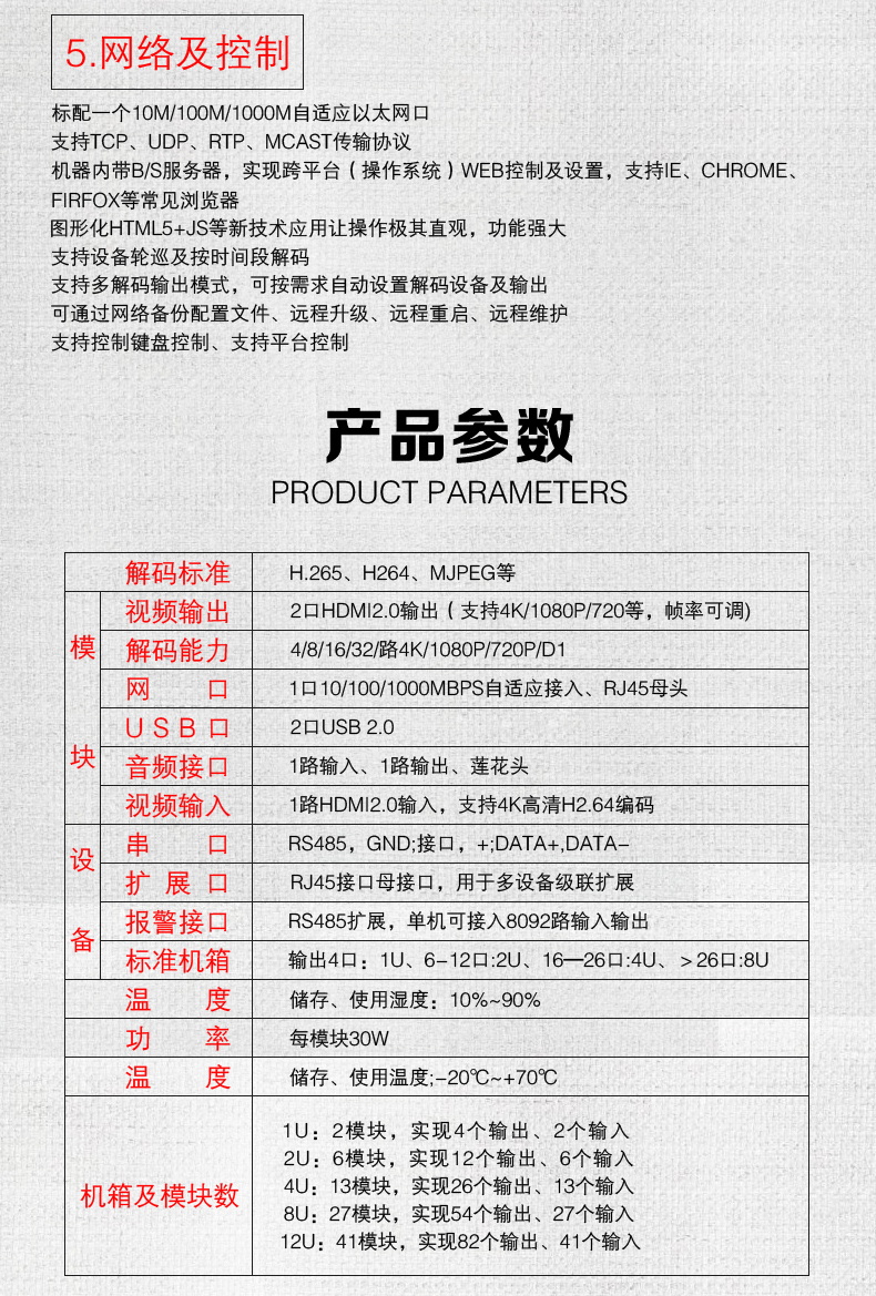 網絡數(shù)字解碼矩陣切換器采用最新的安防專用編解碼芯片,專為H.265標準及4K超高清編解碼而設計,產品采用嵌入式LINUX架構,保障系統(tǒng)的穩(wěn)定運行,采用模塊化設計,可以在大型、超大型數(shù)字安防監(jiān)控系統(tǒng)中實現(xiàn)解碼、編碼、拼接、分割、畫中畫、漫游等功能,為工程項目最大程序解決大數(shù)據數(shù)字化監(jiān)控系統(tǒng)提供解碼上墻及多信號輸入編碼等提供一站式解決方案;設備采用全鋁標準機箱,結構上大氣美觀可靠,散熱性結構化好。
